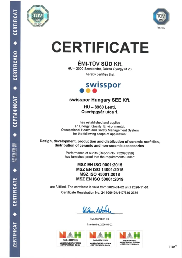 Scopul nostru este să producem și să distribuim produse de cea mai înaltă calitate, toate cu un proces de producție ecologic și eficient din punct de vedere energetic. Siguranța ocupațională este cea mai importantă valoare de bază a swisspor Hungary SEE Kft., în care singurul și acceptabil obiectiv este acela de a fi a opera fără accidente și de a reduce numărul de boli profesionale la zero. Securitatea muncii, protecția sănătății și securitatea psihologică sunt doar unele dintre responsabilitățile cheie ale managerilor noștri, în care implicarea angajaților noștri este esențială, precum și posibilitatea de comunicare cu reprezentanții lucrătorilor și cu forul MEB (protecția și securitatea sănătății în muncă). Pentru a menține și ridica standardul de securitate în muncă, monitorizăm și îmbunătățim condițiile de securitate și sănătate în muncă ale activităților noastre prin conștientizarea abordării preventive. Pentru a îmbunătăți eficacitatea sistemului de management al calității, analizăm parametrii de producție și calitate, riscurile proceselor noastre și feedback-ul clienților noștri. Atingem satisfacția clienților noștri prin dezvoltarea tehnologiilor de producție și formarea continuă a angajaților noștri. În timpul dezvoltării și introducerii de noi produse, precum și la modernizarea produselor existente, luăm în considerare nevoile în schimbare ale pieței, pe lângă aspectele de mediu, și nevoile estetice ale clienților noștri privind potrivirea exactă, planeitatea și longevitatea acoperirii cu țigle.