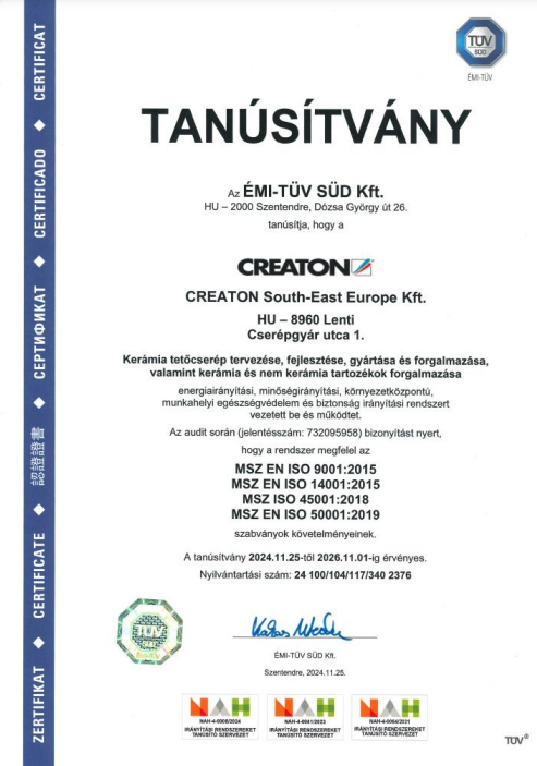 Scopul nostru este să producem și să distribuim produse de cea mai înaltă calitate, toate cu un proces de producție ecologic și eficient din punct de vedere energetic.Siguranța ocupațională este cea mai importantă valoare de bază a CREATON South-East Europe Kft., în care singurul și acceptabil obiectiv este acela de a fi a opera fără accidente și de a reduce numărul de boli profesionale la zero. Securitatea muncii, protecția sănătății și securitatea psihologică sunt doar unele dintre responsabilitățile cheie ale managerilor noștri, în care implicarea angajaților noștri este esențială, precum și posibilitatea de comunicare cu reprezentanții lucrătorilor și cu forul MEB (protecția și securitatea sănătății în muncă). Pentru a menține și ridica standardul de securitate în muncă, monitorizăm și îmbunătățim condițiile de securitate și sănătate în muncă ale activităților noastre prin conștientizarea abordării preventive. Pentru a îmbunătăți eficacitatea sistemului de management al calității, analizăm parametrii de producție și calitate, riscurile proceselor noastre și feedback-ul clienților noștri.Atingem satisfacția clienților noștri prin dezvoltarea tehnologiilor de producție și formarea continuă a angajaților noștri.În timpul dezvoltării și introducerii de noi produse, precum și la modernizarea produselor existente, luăm în considerare nevoile în schimbare ale pieței, pe lângă aspectele de mediu, și nevoile estetice ale clienților noștri privind potrivirea exactă, planeitatea și longevitatea acoperirii cu țigle.Pe parcursul dezvoltărilor și modernizărilor produselor, am dezvoltat un proces de selectare a furnizorului de servicii de procese care urmează să fie externalizate și de monitorizare a performanței acestora, prin care ne putem asigura că dezvoltările și modernizările corespund așteptărilor noastre în toate privințele.Suntem convinși că protecția mediului, urmărirea utilizării raționale a energiei, dezvoltarea structurii, proceselor și instrumentelor noastre de afaceri, precum și gestionarea problemelor legate de comportament, organizatorice și tehnice sunt indispensabile pentru atingerea excelenței operaționale.Ne dezvoltăm constant sistemul de management integrat, evaluând posibilele riscuri, luând în considerare întregul ciclu de viață al proceselor și produselor noastre. În timpul activităților de planificare, definim ca obiectiv îmbunătățirea performanței managementului energetic. Ne creștem continuu eficiența și performanța energetică și, de asemenea, ne străduim să prevenim poluarea, asigurând astfel minimizarea impactului nociv asupra mediului, cauzat de activitățile noastre.Compania noastră consideră impactul schimbărilor climatice ca fiind un factor semnificativ și abordează proactiv provocările care decurg din acestea, asigurând astfel stabilitatea și competitivitatea pe termen lung a companiei. Menținem o relație corectă și de cooperare cu partenerii noștri furnizori, așteptându-ne să ne îndeplinească nevoile la cel mai înalt nivel posibil, precum și să furnizeze produse și servicii eficiente din punct de vedere energetic, care au un efect favorabil asupra performanței noastre de management energetic.Pentru a realiza ceea ce este definit în politică, compania noastră operează, dezvoltă și certifică sisteme de management al calității, orientate către mediu, securitate și sănătate în muncă și management energetic conform ISO 9001:2015, ISO 14001:2015, ISO 45001:2018 și standardele ISO 50001: 2018. cu o organizație de certificare acreditată.Lenti, 31 octombrie 2025